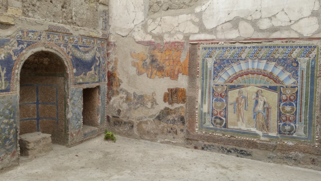 Herculaneum is closer to Vesuvius crater than Pompeii but the winds blew toward Pompeii when Vesuvius erupted and gave Herculaneum time to escape until that night. Unlike Pompeii, most of Herculaneum is not excavated.
